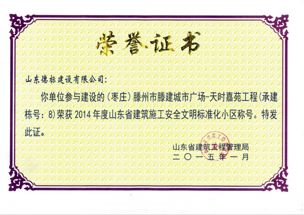 2014年度山東省安全文明標(biāo)準(zhǔn)化小區(qū)-天時嘉苑工程