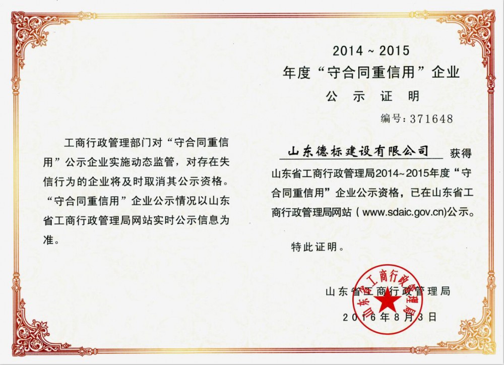 2014-2015年度山東省工商行政管理局“守合同重信用···