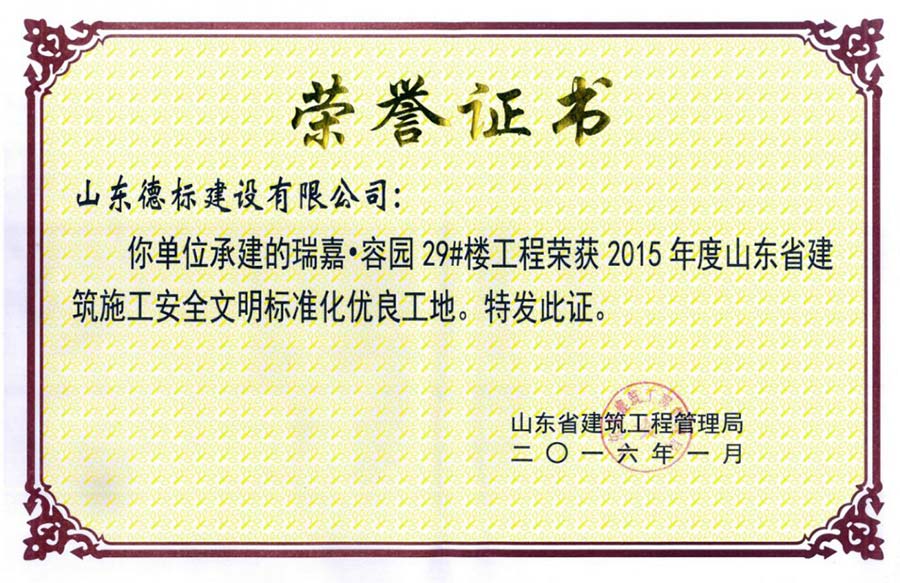 2015年度山東省建筑施工安全文明標(biāo)準(zhǔn)化優(yōu)良工地-瑞嘉容···